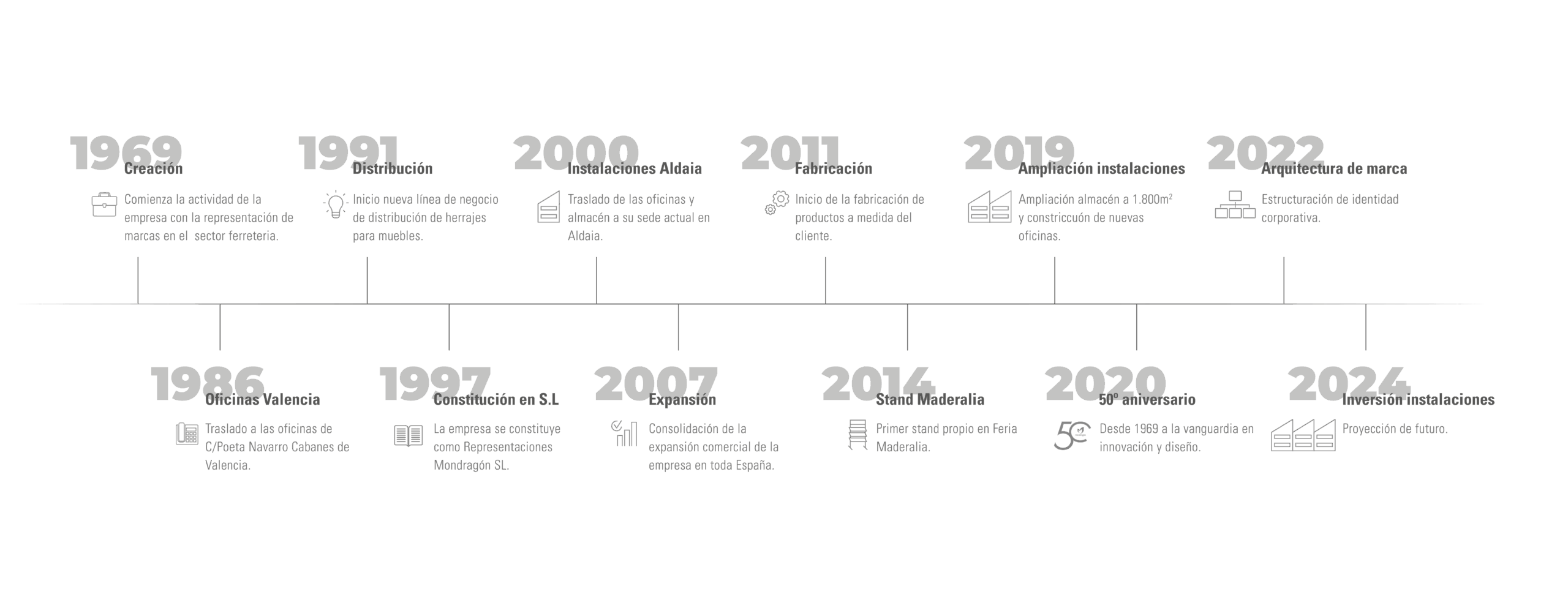 Mondragón es una empresa volcada desde 1969 en la distribución de herrajes para muebles de la más alta calidad. En 2019 celebró su 50 Aniversario. Una efeméride en la que continua con el mismo objetivo con el que empezó en sus inicios, dar el mejor servicio a sus clientes.