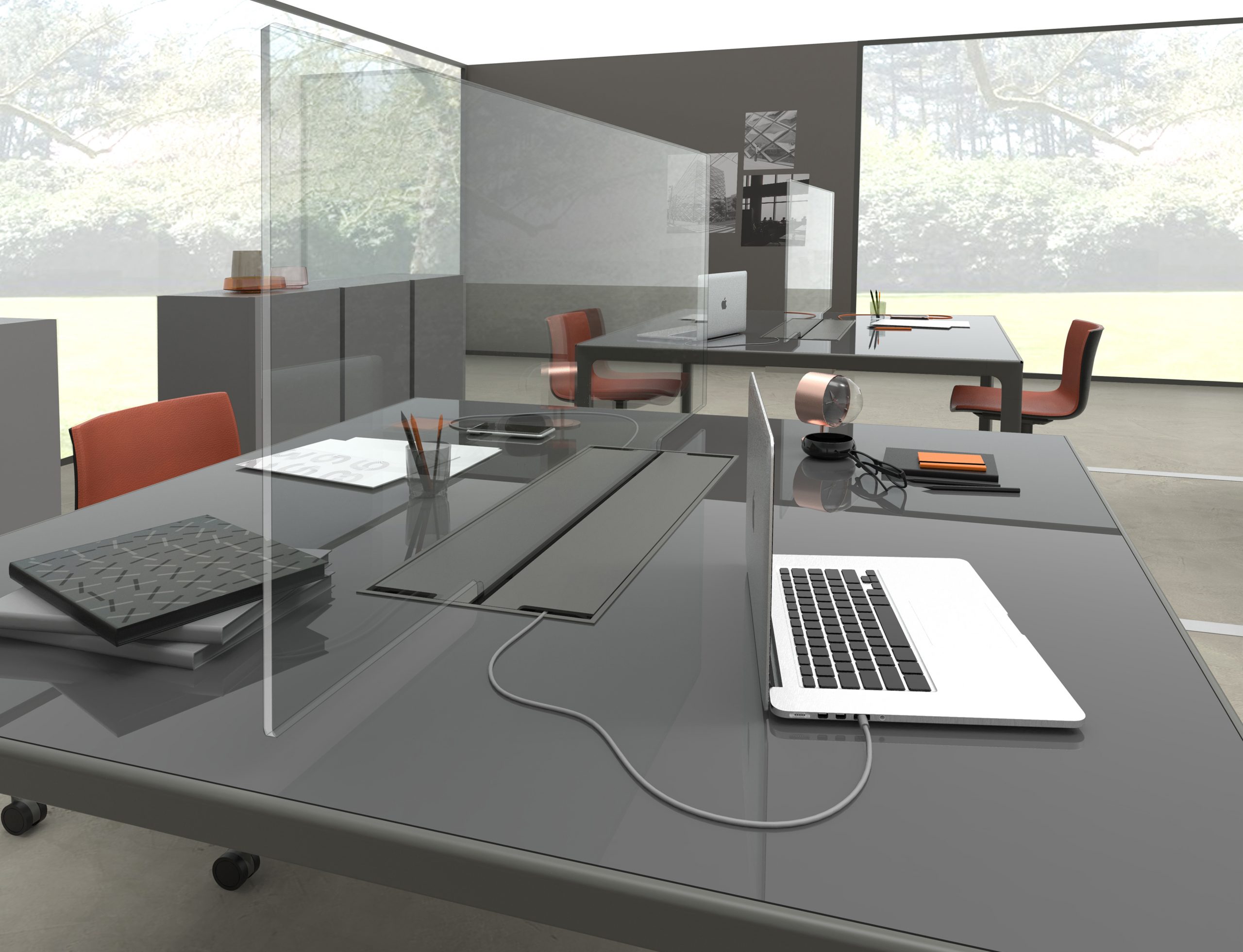 Canal funcional con bandejas para cables y almacenaje que se integra en el escritorio de la cocina para la organización del puesto de trabajo.