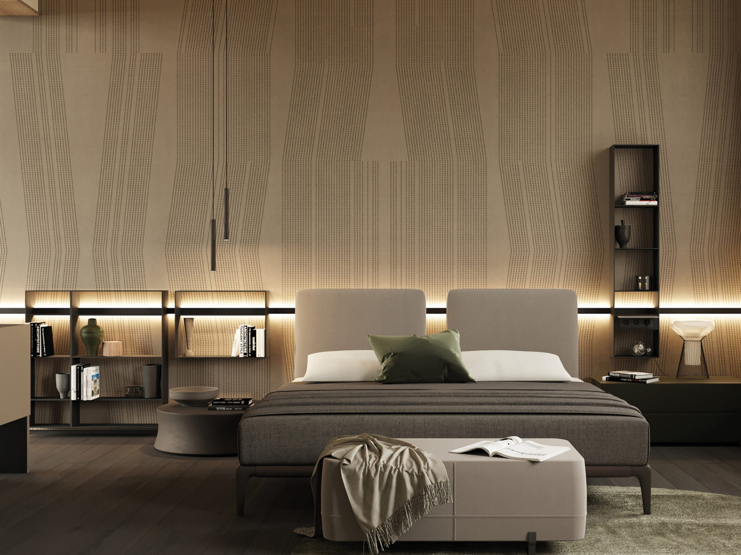 Sistema de iluminación con perfil luminoso horizontal de aluminio anodizado, se aplica a la pared y traza una línea de luz que divide el entorno. Cuenta con dos lámparas LED lineales que crean un efecto homogéneo y una atmósfera envolvente. La lámpara superior produce un efecto ambiente mientras que la inferior proyecta sobre la encimera o el mueble garantizando una iluminación adecuada, evitando la necesidad de instalar fuentes de luz adicionales.