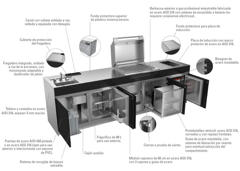 Diseñada especialmente para uso en exteriores, esta solución para cocinar al aire libre combina los últimos avances en tecnología y diseño con materiales de alta durabilidad como el acero AISI 316, brindando así una experiencia culinaria excepcional incluso en condiciones climáticas adversas.