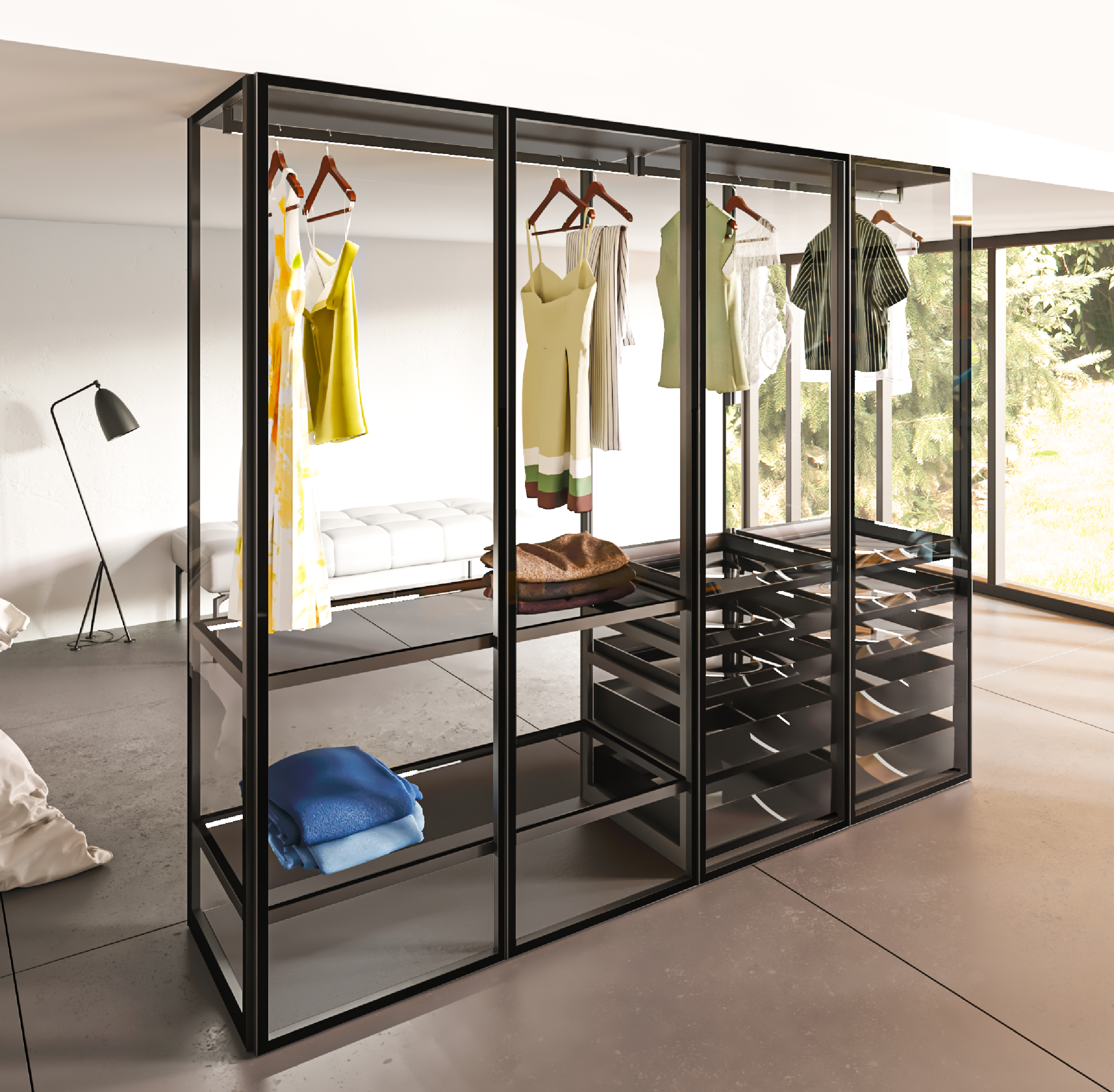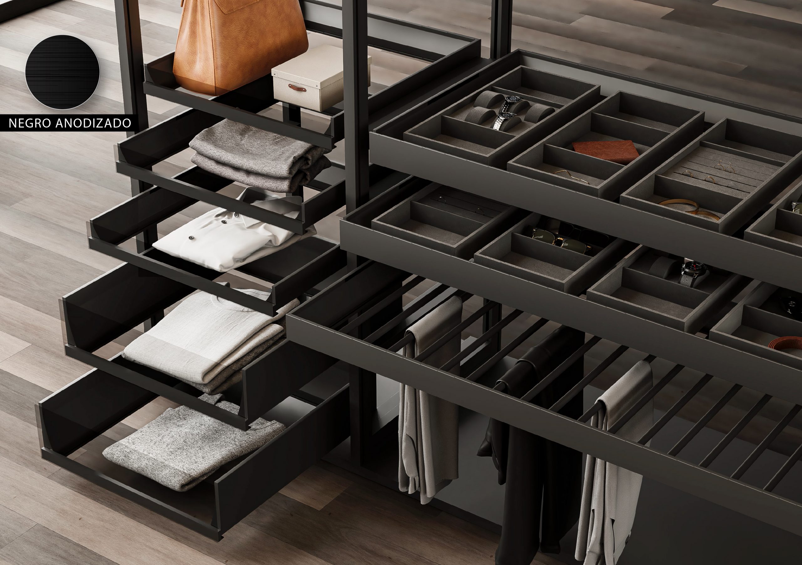 Desde Mondragón os presentamos los cajones Mybe de Trial, la solución para interiorismo de armario que destaca por su estilo minimalista y elegante. Su perfilería perimetral en acabado 100% aluminio negro anodizado combina con las diferentes opciones de bases compatibles según gustos o necesidades del cliente; vidrio, madera o cuero. De la misma forma, el frontal del cajón también puede ser personalizado en aluminio o en vidrio Transparente, Parsol o Dark Grey.