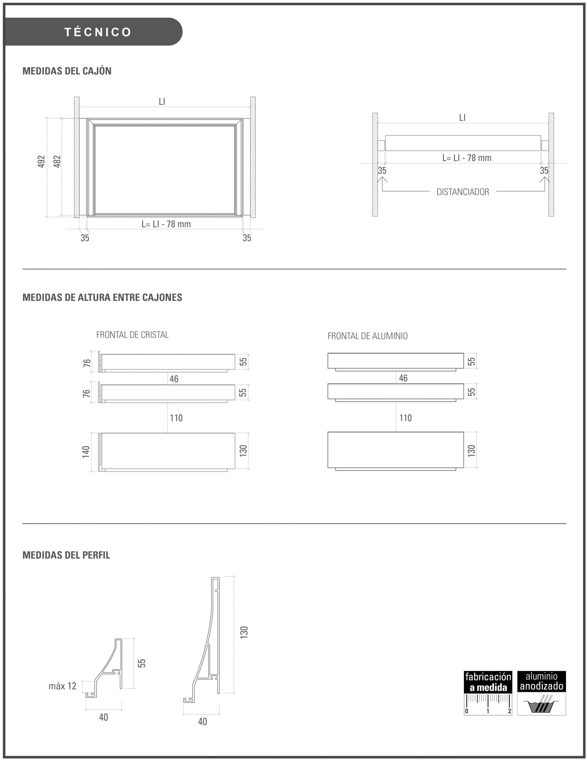 Esta solución de cajón tiene dos opciones de altura: 55mm o 130mm y tres diferentes medidas de ancho disponibles: 450mm, 500mm o 900mm. También existe la posibilidad de fabricación a medida indicando medida interior del cajón. Lo que permite realizar distintas combinaciones dependiendo del espacio disponible del armario.