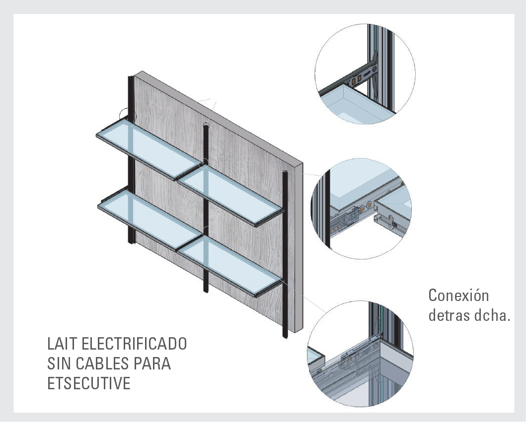 Los estantes LAIT son compatibles para su montaje con ETSECUTIVE– Sistema de vestidor con paneles sobre cremalleras ocultas fijadas a la pared. Disponible con sistema electrificado sin cables para conexión de estantes LAIT (Permite variar la altura de los estantes iluminados al no tener cables)