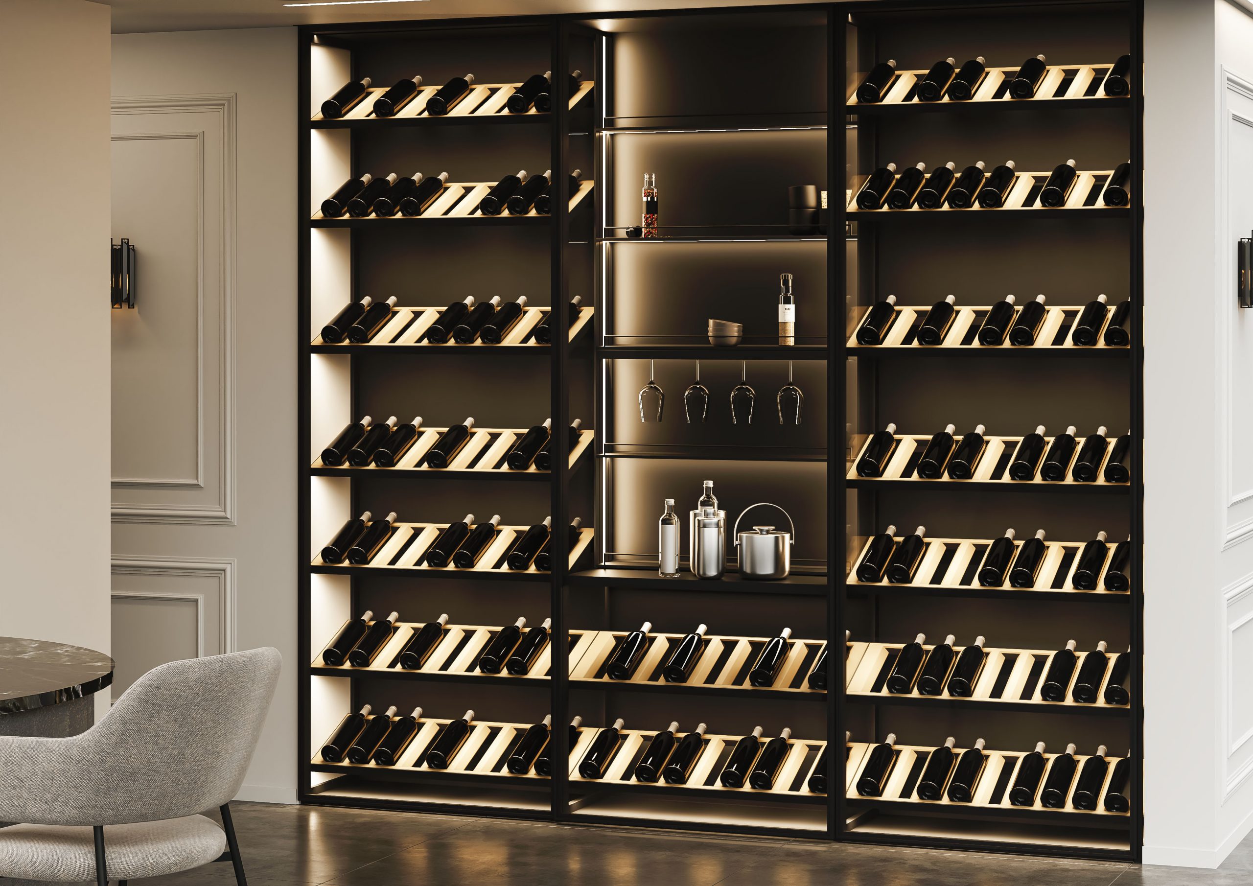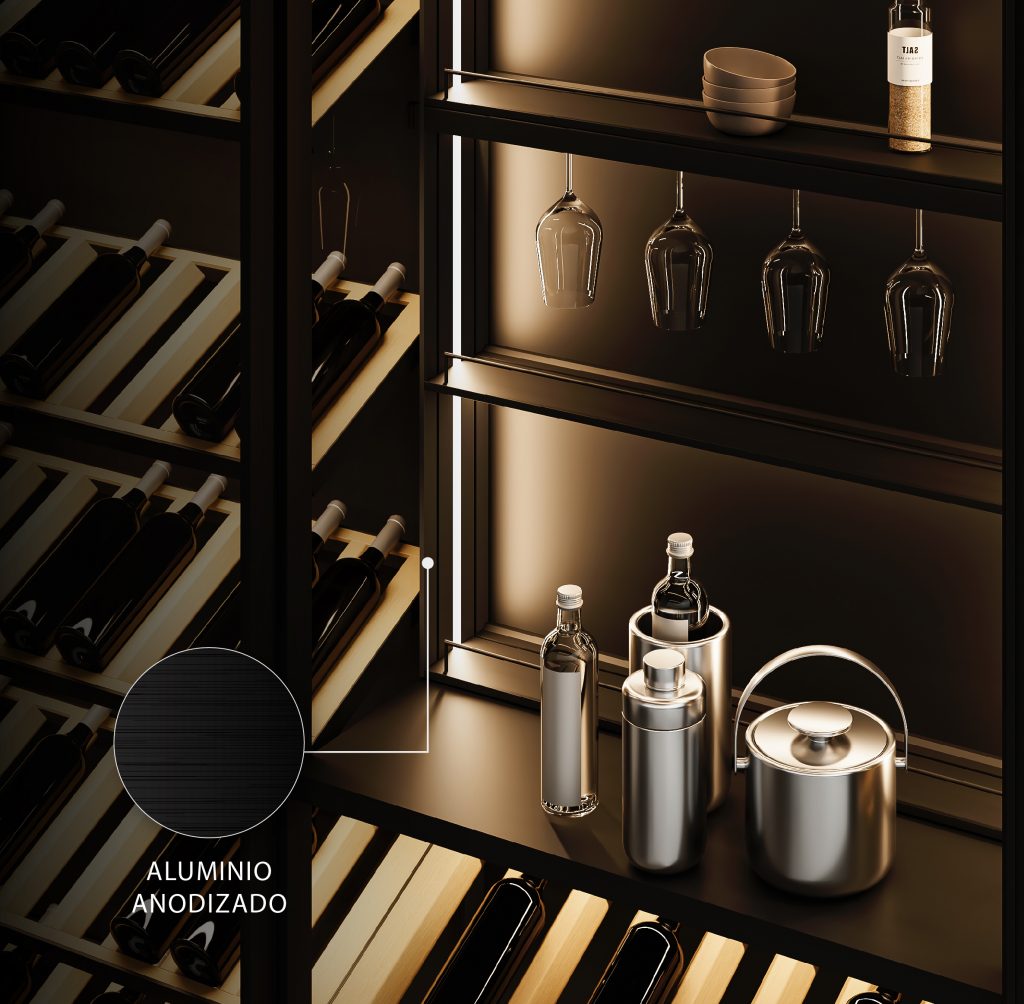 La parte externa del perfil vertical es totalmente lisa, sin tornillería. Se puede variar la posición de los estantes dependiendo de las necesidades de almacenaje. Un producto minimalista y elegante capaz de elevar la calidad de las cocinas, salas de estar y baños.