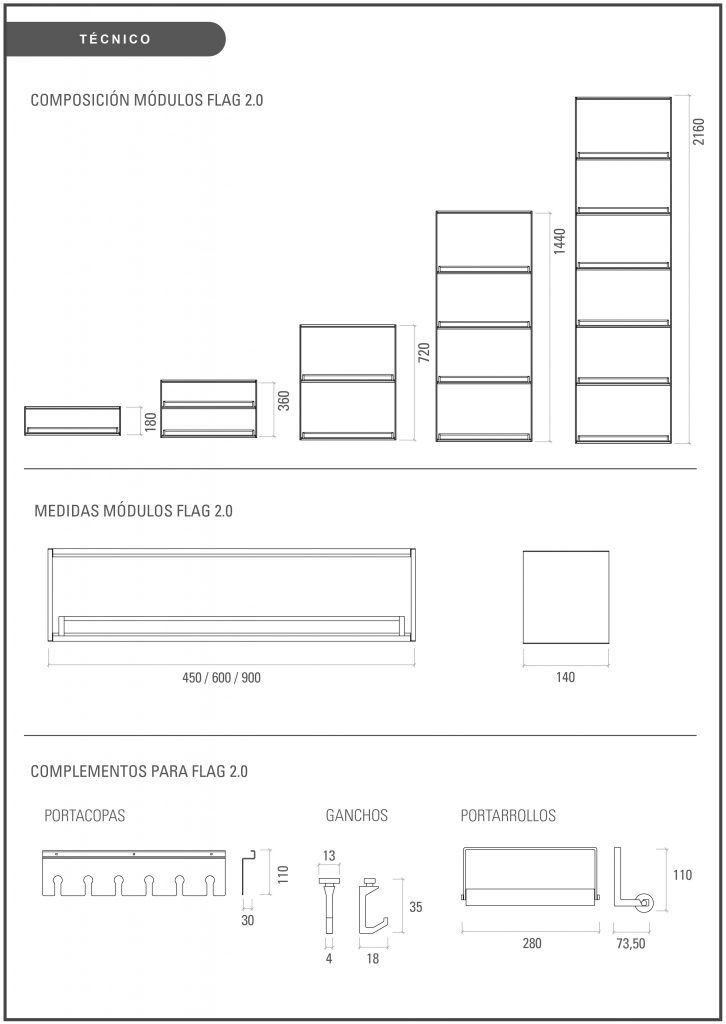 El sistema incluye la posibilidad de configurar los estantes con diferentes complementos: ganchos, portarrollos y portacopas. Todos ellos se pueden implementar en la parte inferior de los estantes y elevan la configuración y la funcionalidad del producto.
