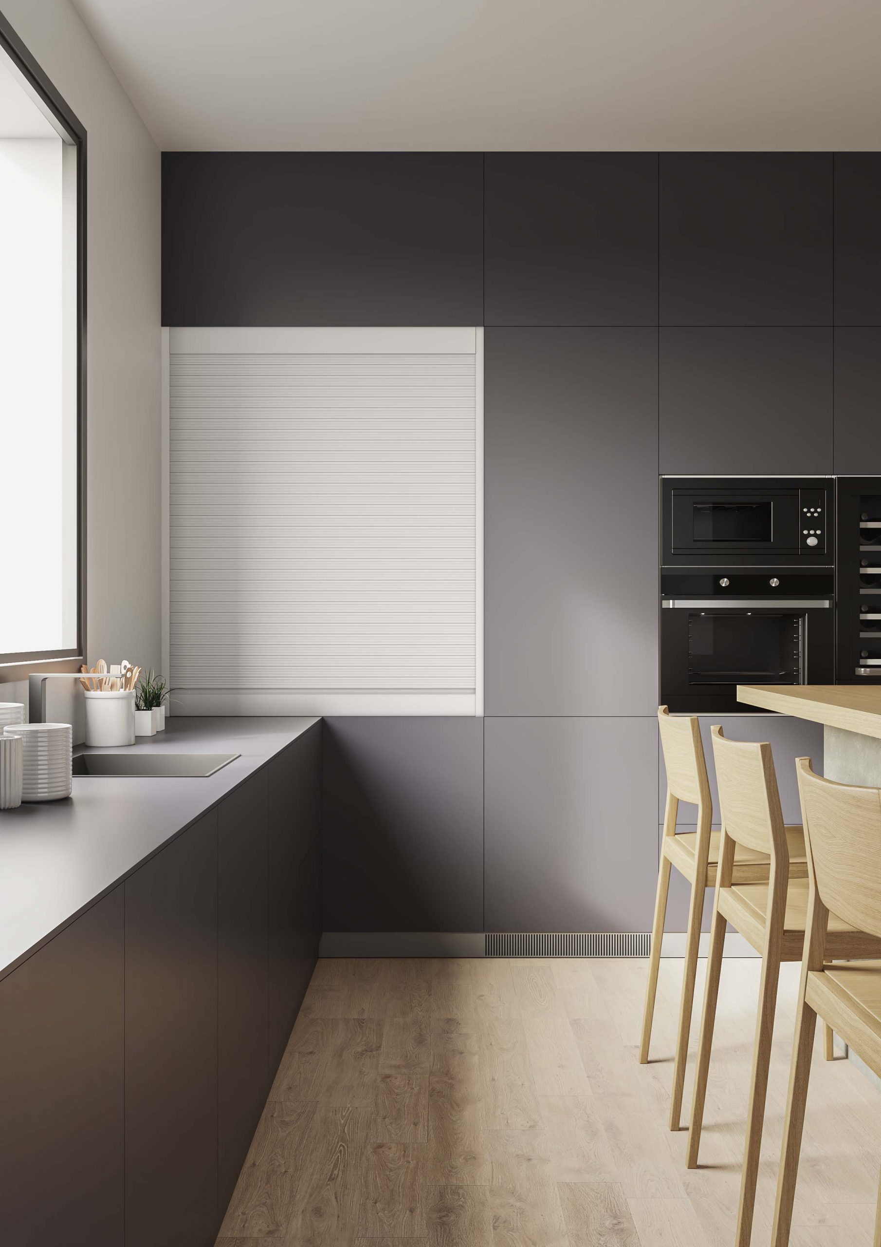 Las persianas con lama Rhythms de 25mm están disponibles en cacao, blanco mate y negro mate. Las de lama de 40mm están disponibles en blanco mate y negro mate. En ambas versiones con una altura de 900mm a 1500mm y una anchura de 450mm a 900mm.