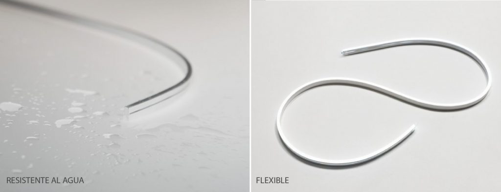 El Perfil Inclinado de aluminio es compatible con Mini Octopus de L&S, una tira LED de silicona blanca flexible de 4 mm de ancho.