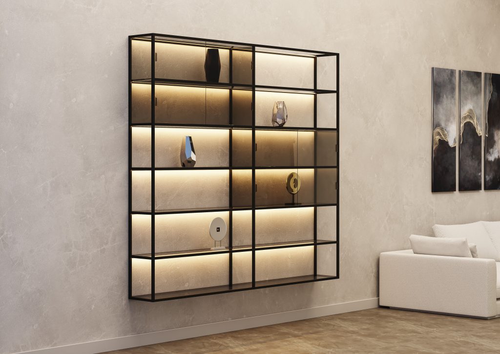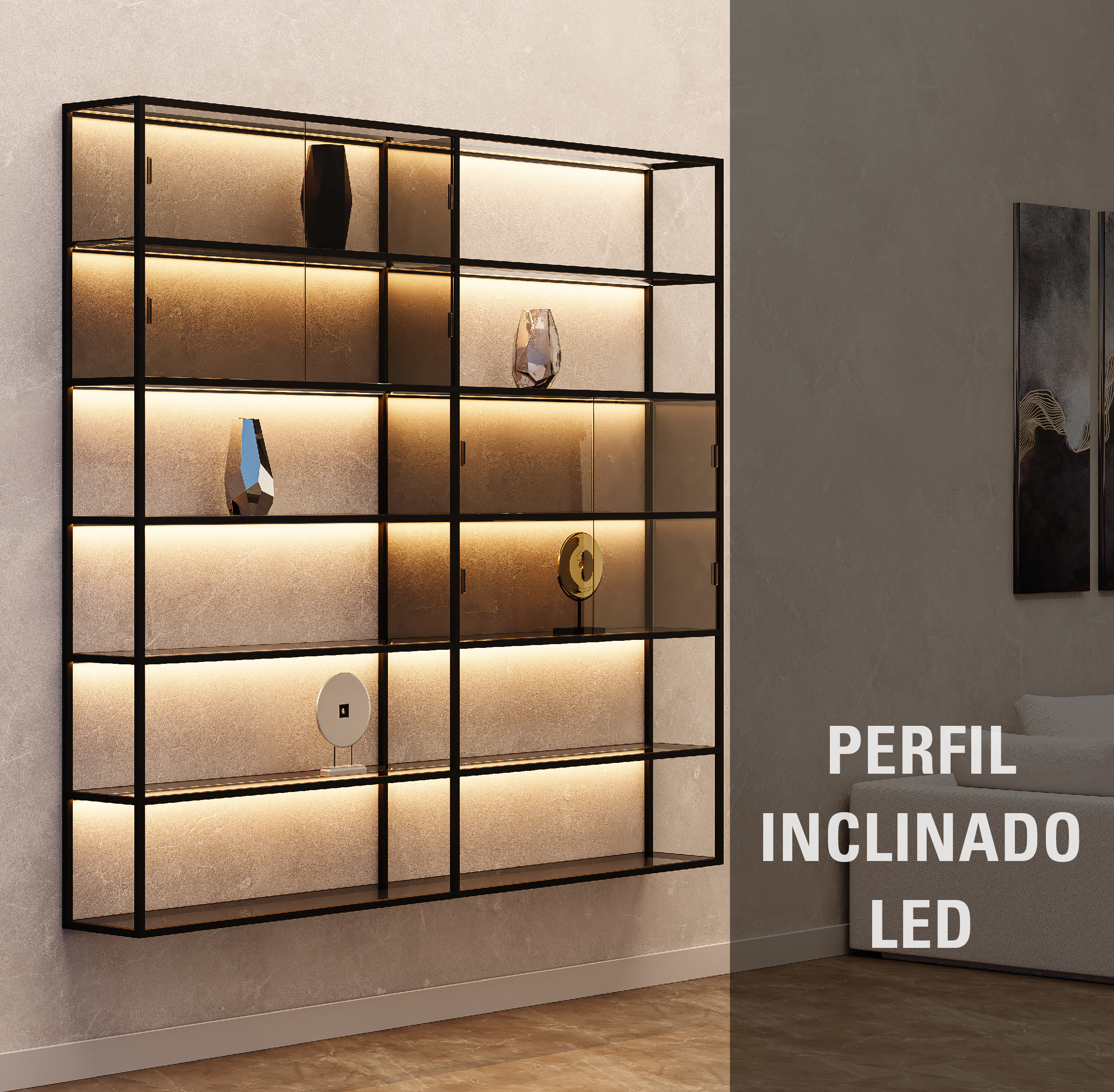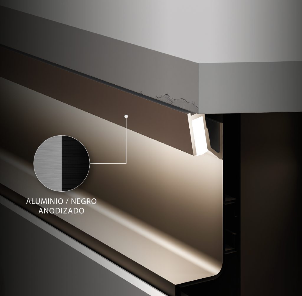 Este perfil, en acabado aluminio o negro anodizado, ofrece una infinidad de soluciones. Puede colocarse tanto en el perfil gola, en el zócalo, en espejos y muebles de baño como para iluminar estructuras auxiliares y estanterías desarrolladas con perfilería P20.