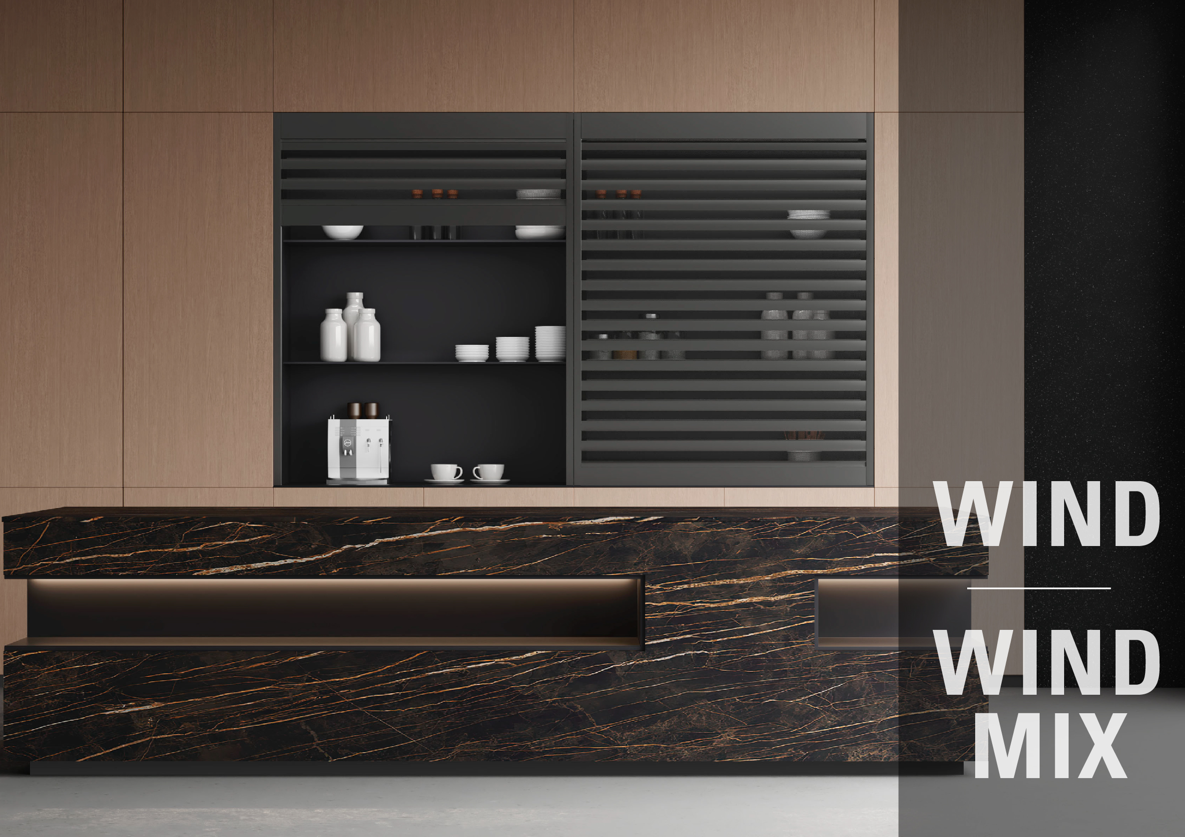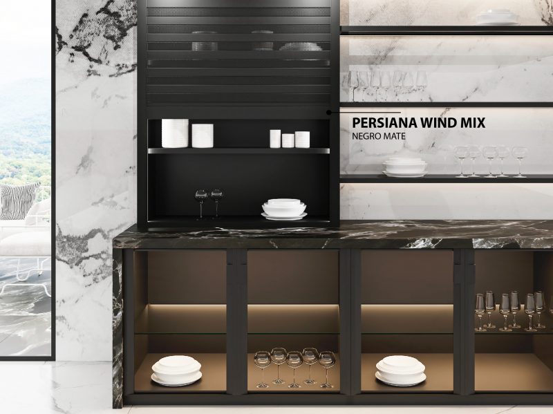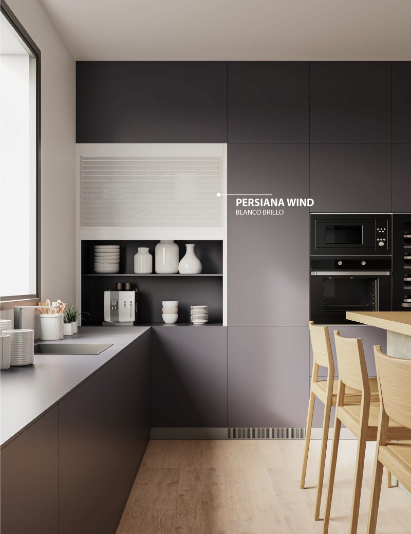 Desde Mondragón os presentamos nuestras nuevas versiones de persianas de alumino WIND y WIND MIX. Las persianas Wind, están fabricadas 100% en extrusión de aluminio con uniformidad de acabado y sin piezas plásticas para evitar roturas y garantizar una gran durabilidad. Estan diseñadas con lamas microperforadas que dejan entrever levemente el interior del armario aportando profundidad a la cocina. Las persianas Wind Mix son la combinación de las lamas opacas Box Milano con las Wind.