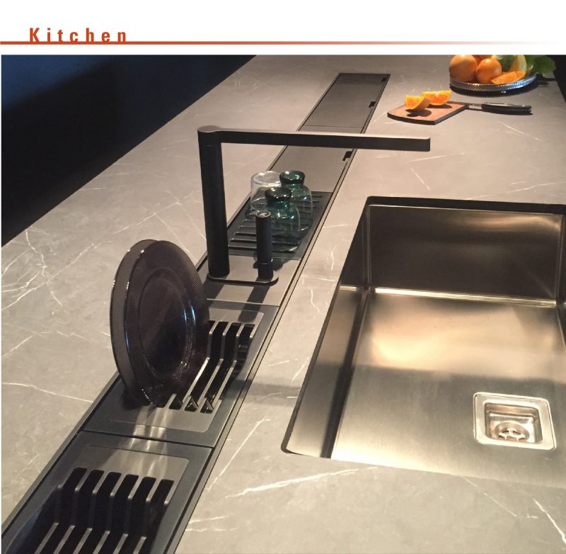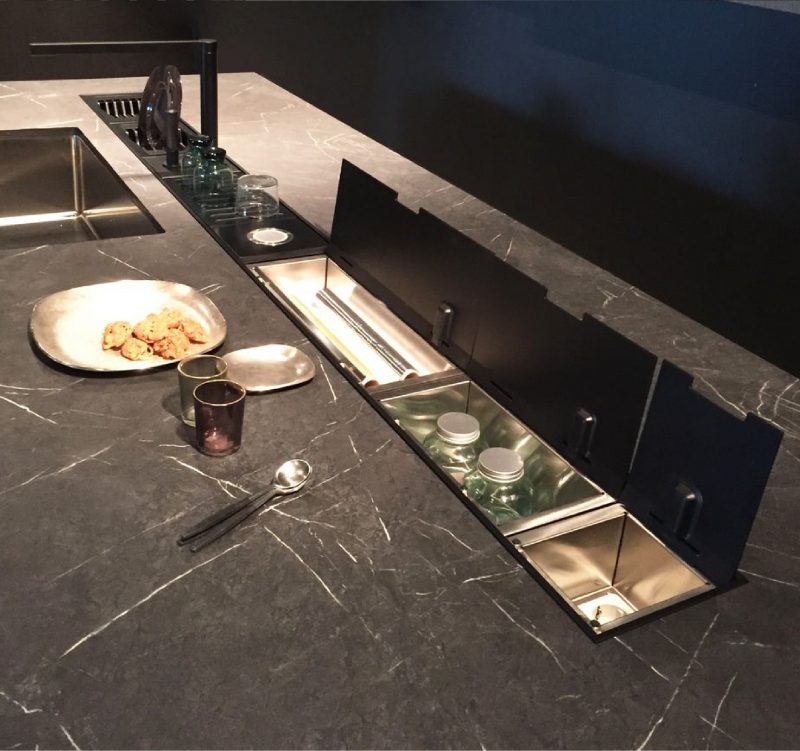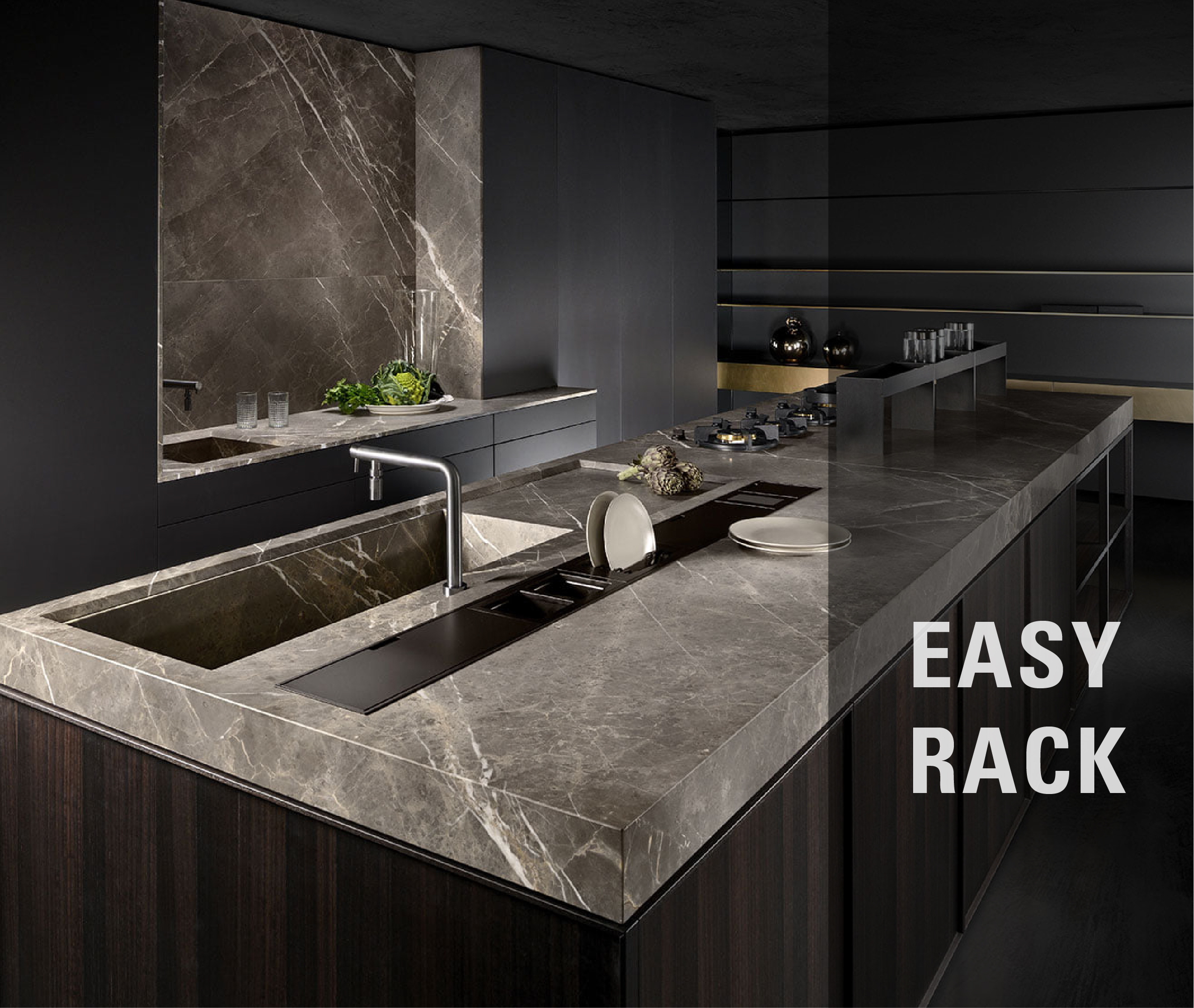 El Easy Rack se presenta en dos versiones diferentes: enrasado o en superficie. Además, cuenta con la opción de elegir los complementos que mejor se adapten a tu necesidad o gusto. Un sistema práctico y refinado que combina utilidad y elegancia en una solución genial. Posibilidad de conexión a red para el suministro eléctrico de los componentes con cargadores o enchufes. En la cocina permite conexión a toma de agua con grifo y también la instalación con desagüe directo a red para la correcta evacuación del agua.