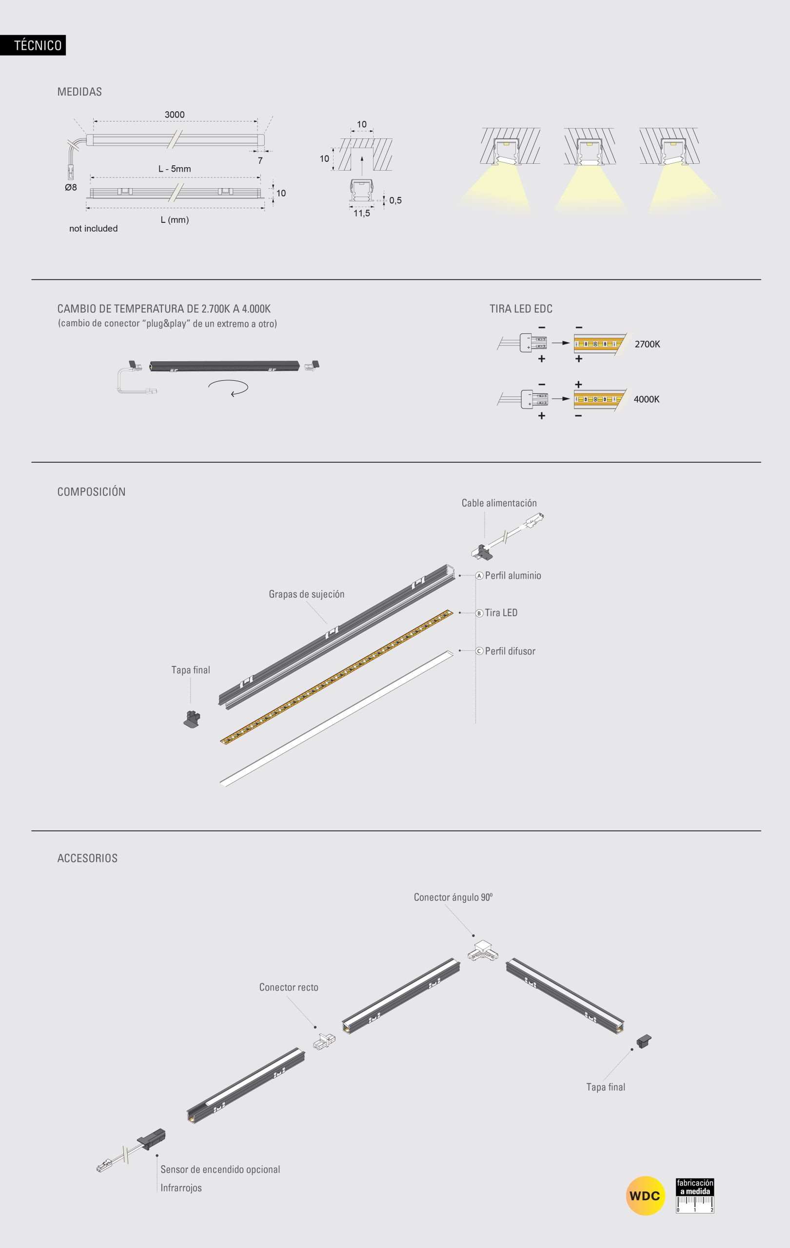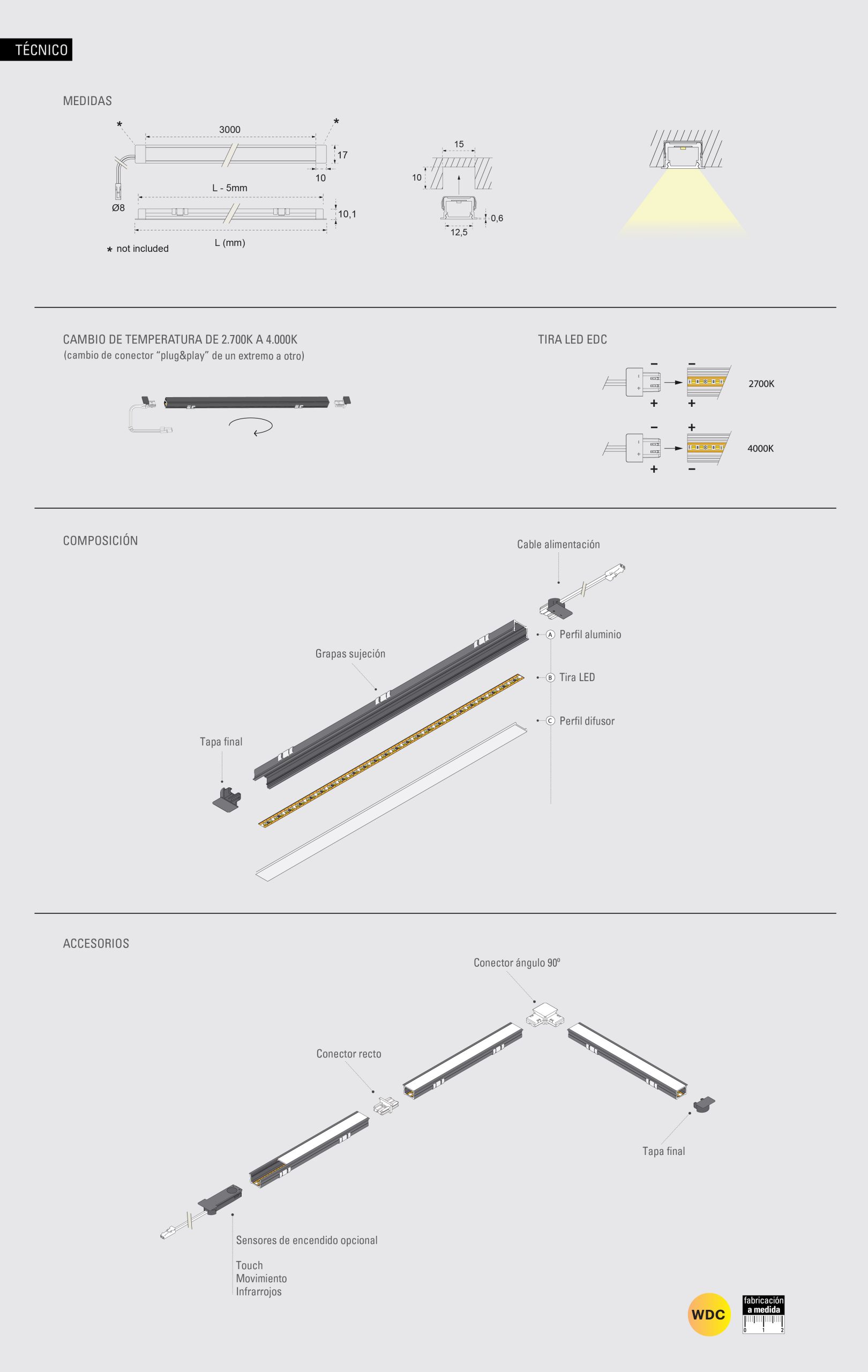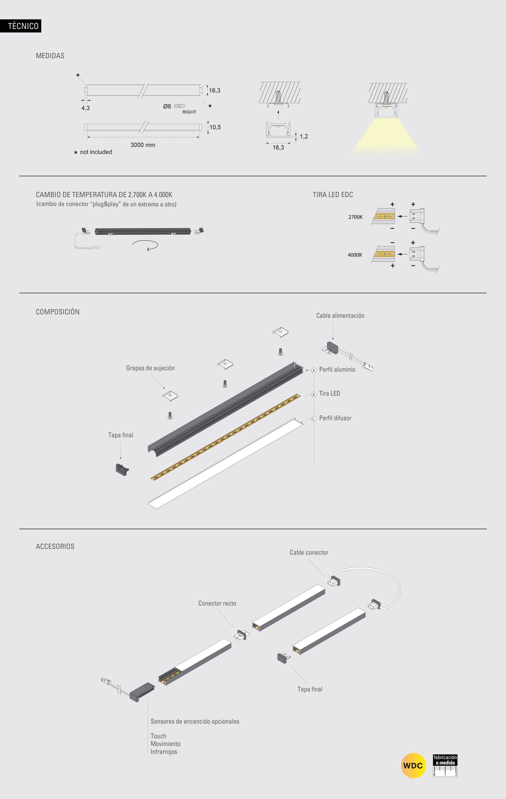 Lampara de superficie de 16,3mm que puede cortarse en cualquier punto y elegir temperatura de color, gracias a la tecnología de la tira WDC de Doble LED (2700K – 4000K). Con conexiones Plug&Play de conexión directa o con sensores ya integrados (Touch / Infrarrojo / Movimiento).