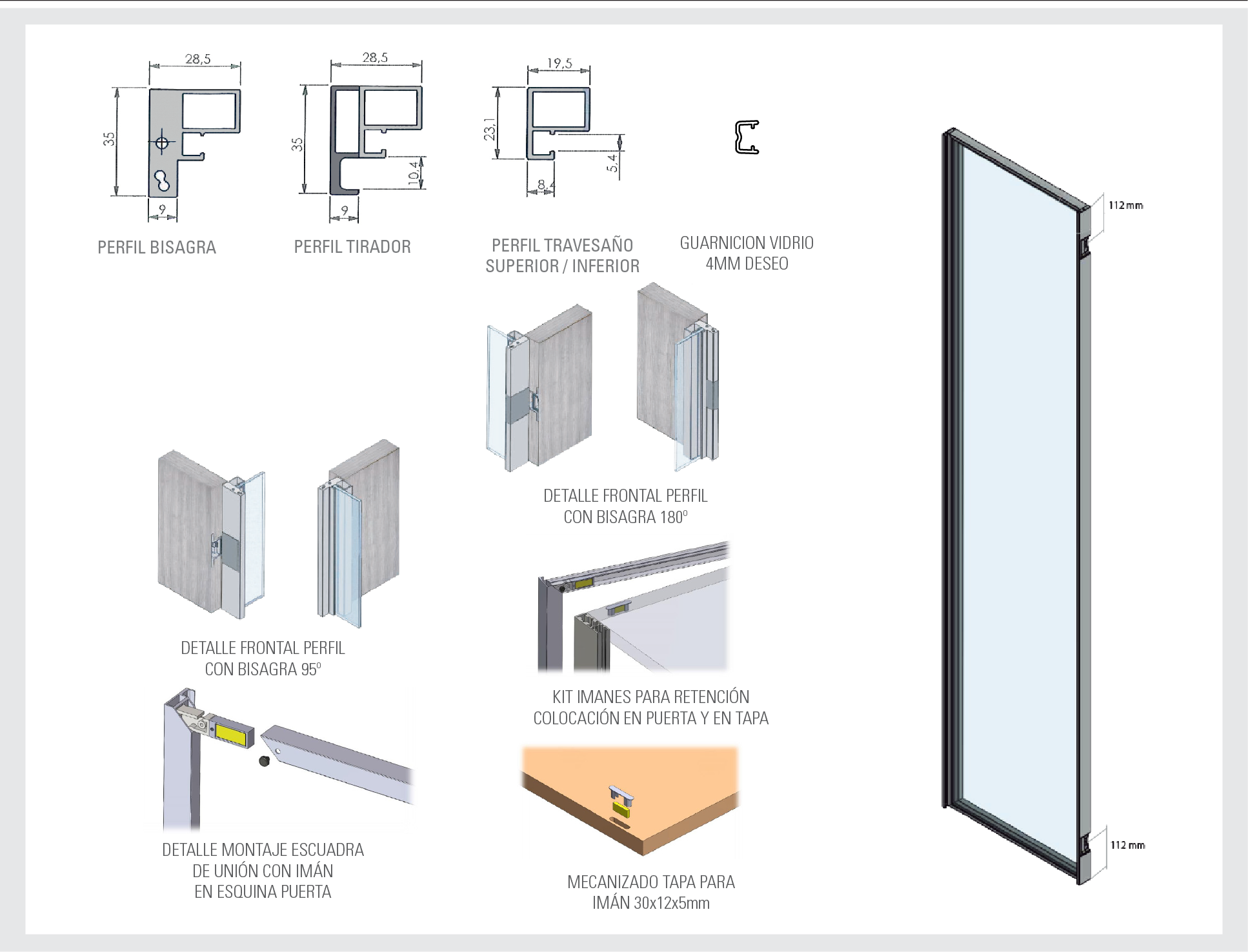 Asimismo, para asegurar un cierre completo y mantener la puerta firmemente cerrada, se integra un sistema de imán en la parte superior del perfil de la puerta, lo que garantiza que permanezca completamente cerrada y pegada al casco del mueble en todo momento.