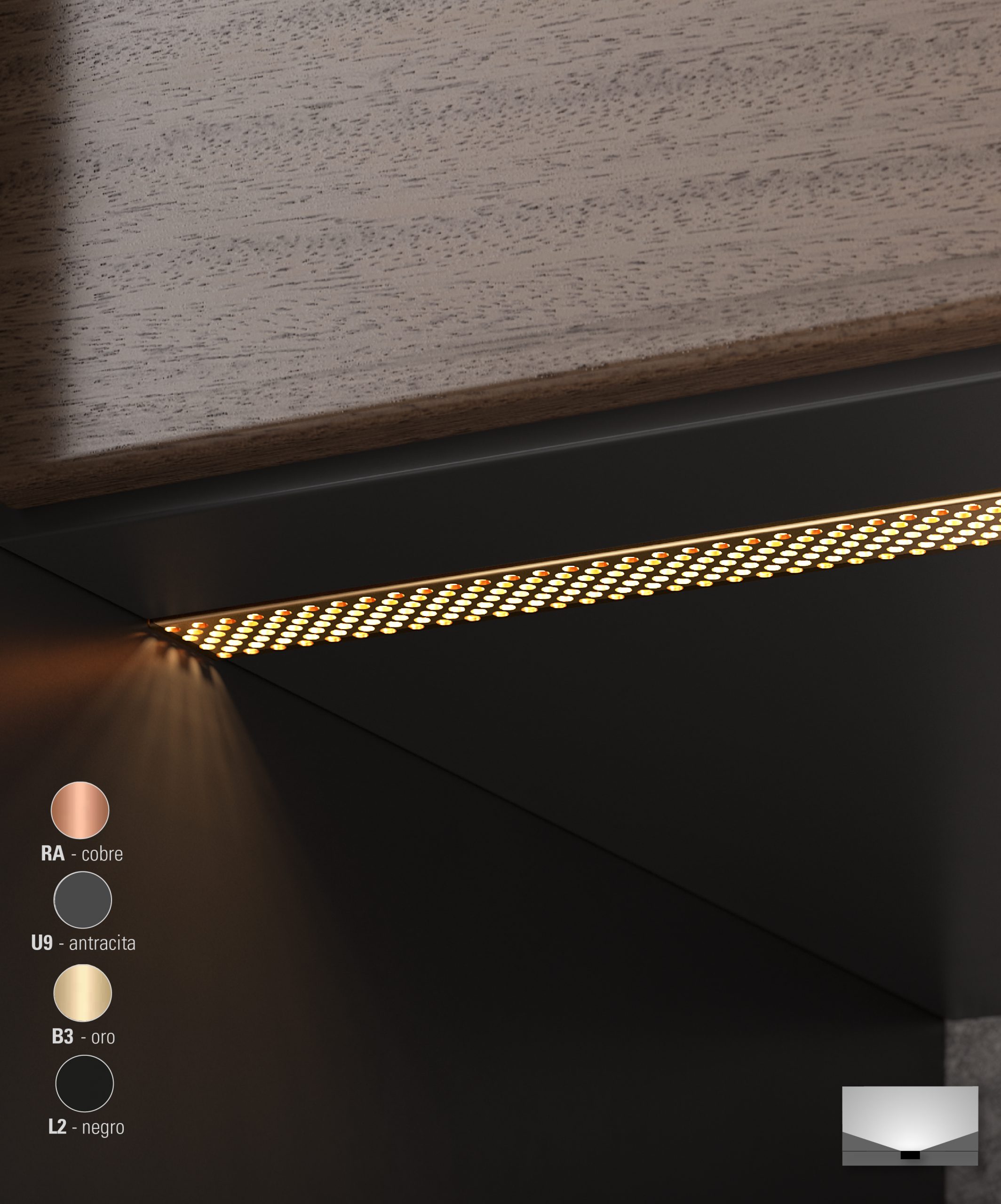 Se suministra con la tira 120 LED EDC de L&S y con sistema de encendido directo, sensor movimiento o sensor infrarrojos. Disponible en acabados cobre, antracita, oro y negro.