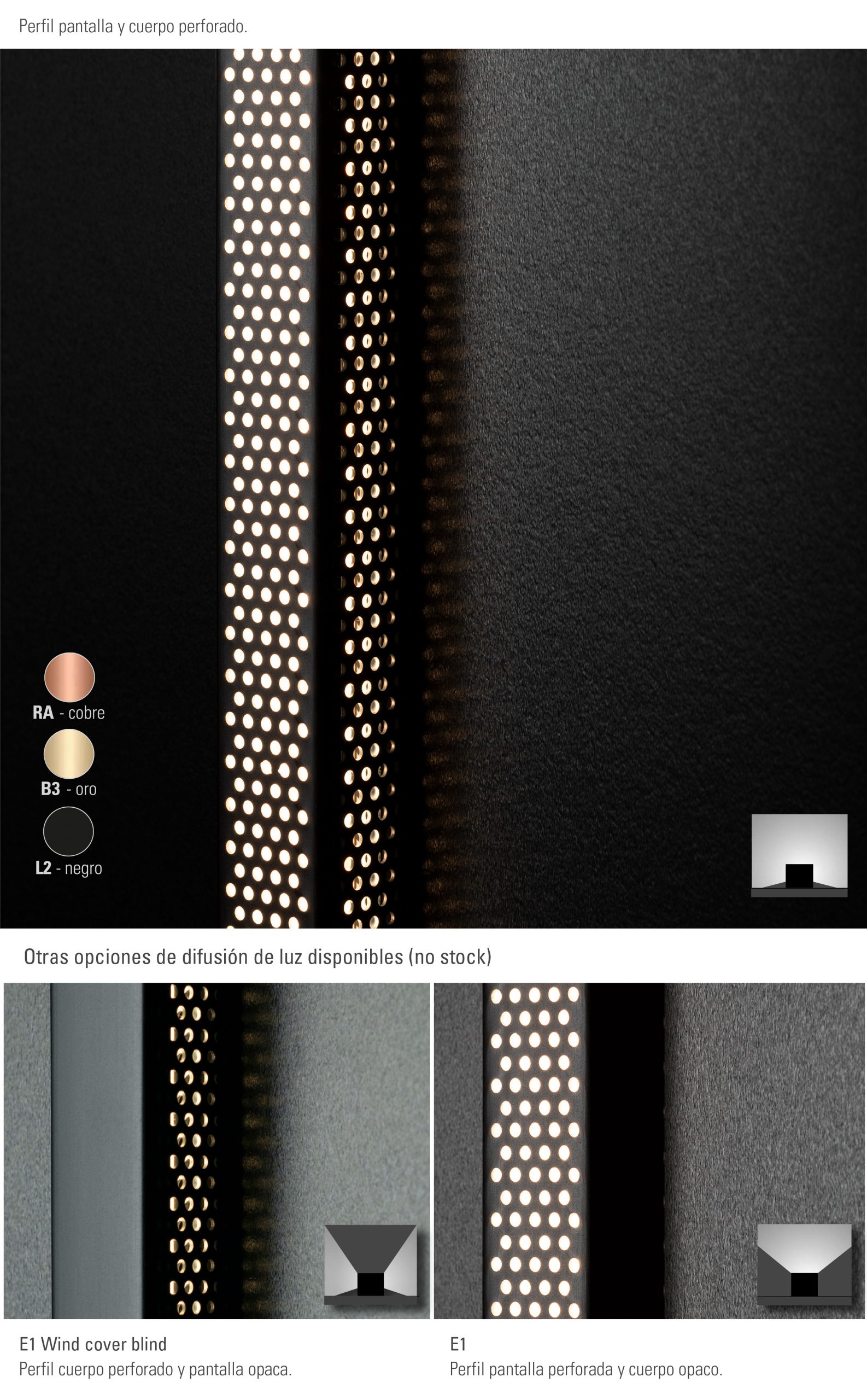 La estructura del Windlight E1 Wind Superficie se compone de cuatro elementos: perfil pantalla con aluminio microperforado, cuerpo de aluminio microperforado, base atornillada y tapas.